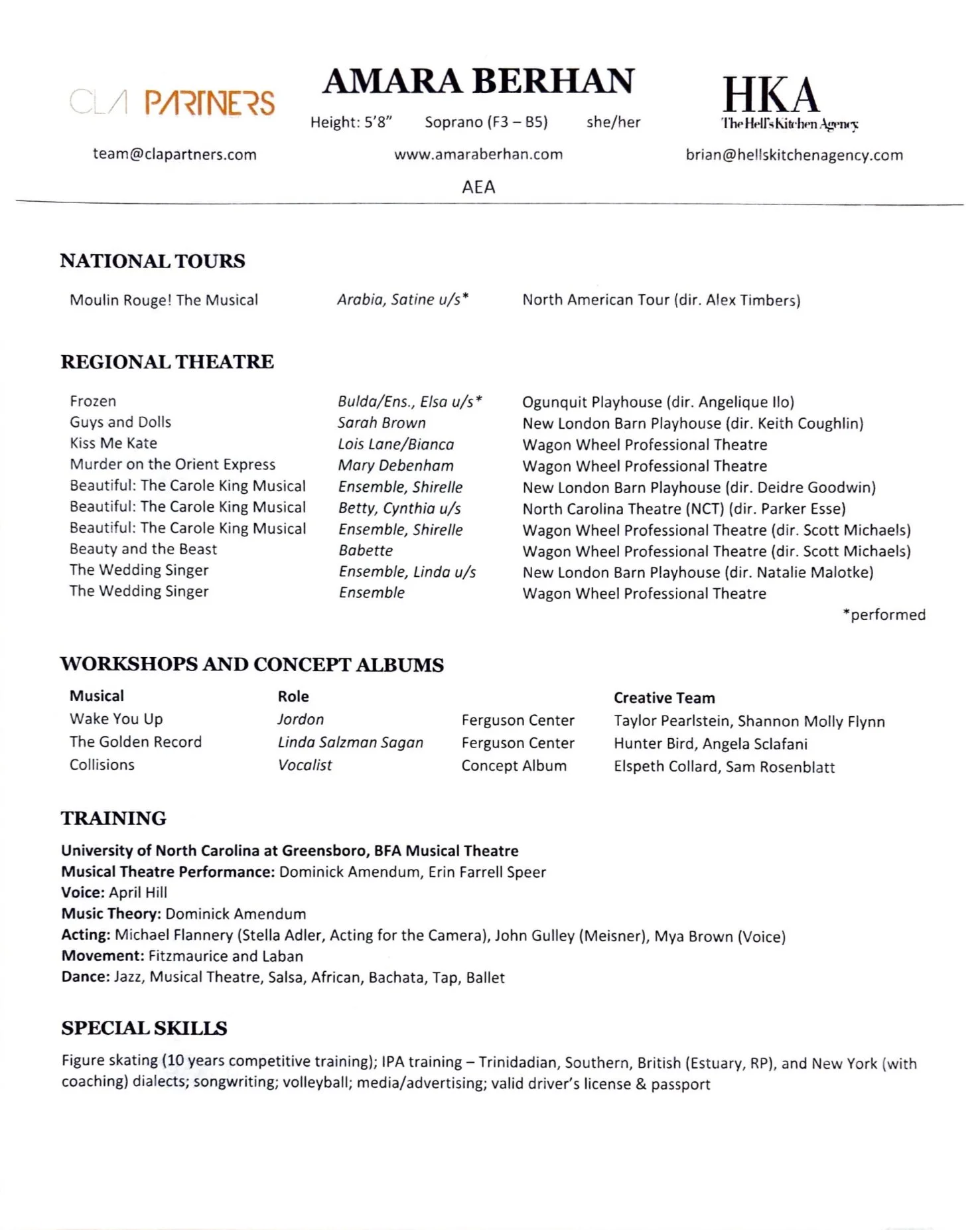 Outside of theater, you can catch me taking photos of beautiful people/moments, writing songs, or dusting off the old skates (see special skills for a glimpse into all of these things). I can also be found hosting girls’ nights for friends, calling my mom, watching the latest season of The Bachelor(ette) or listening to Taylor Swift (Taylor’s Version… obviously).